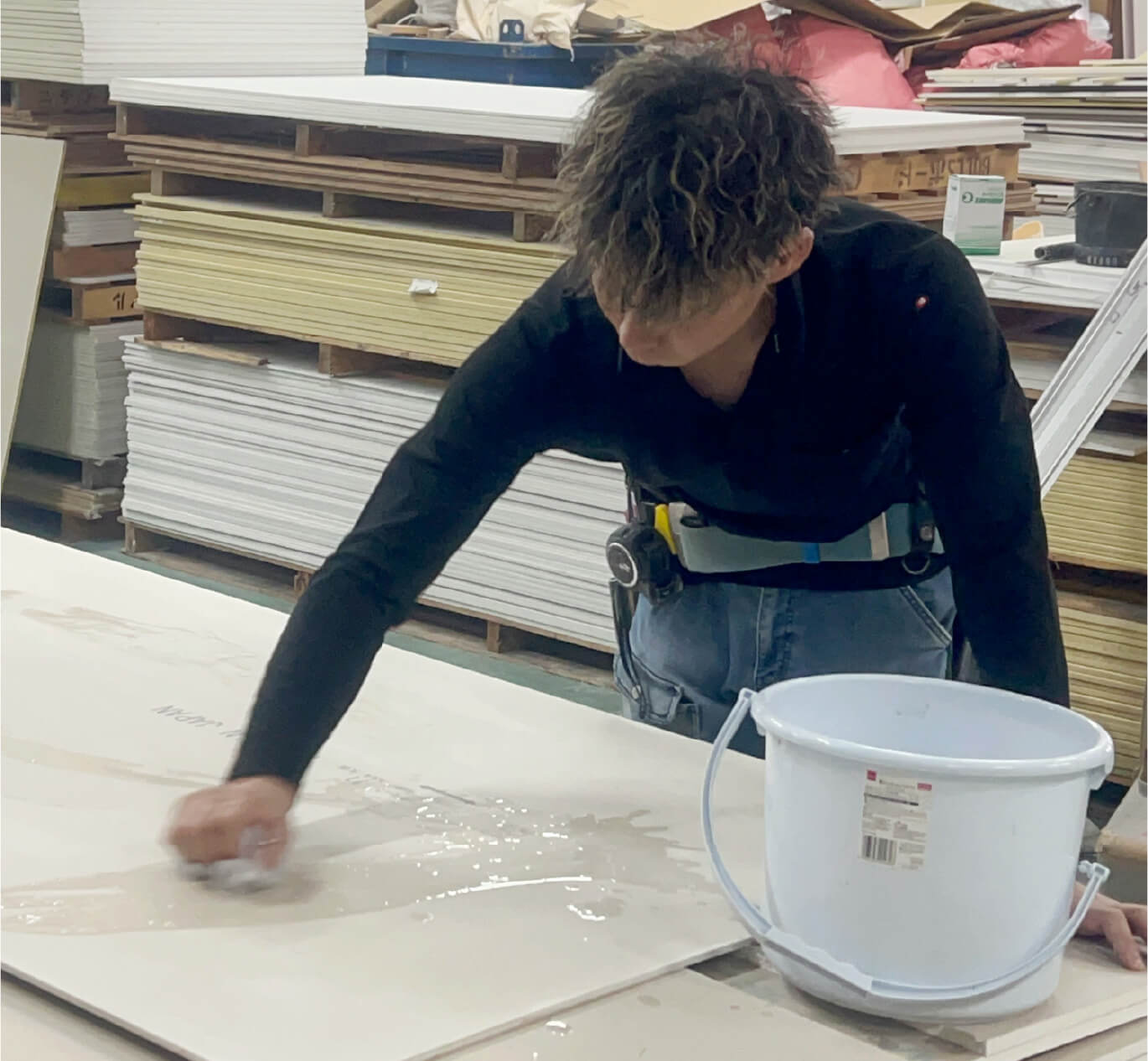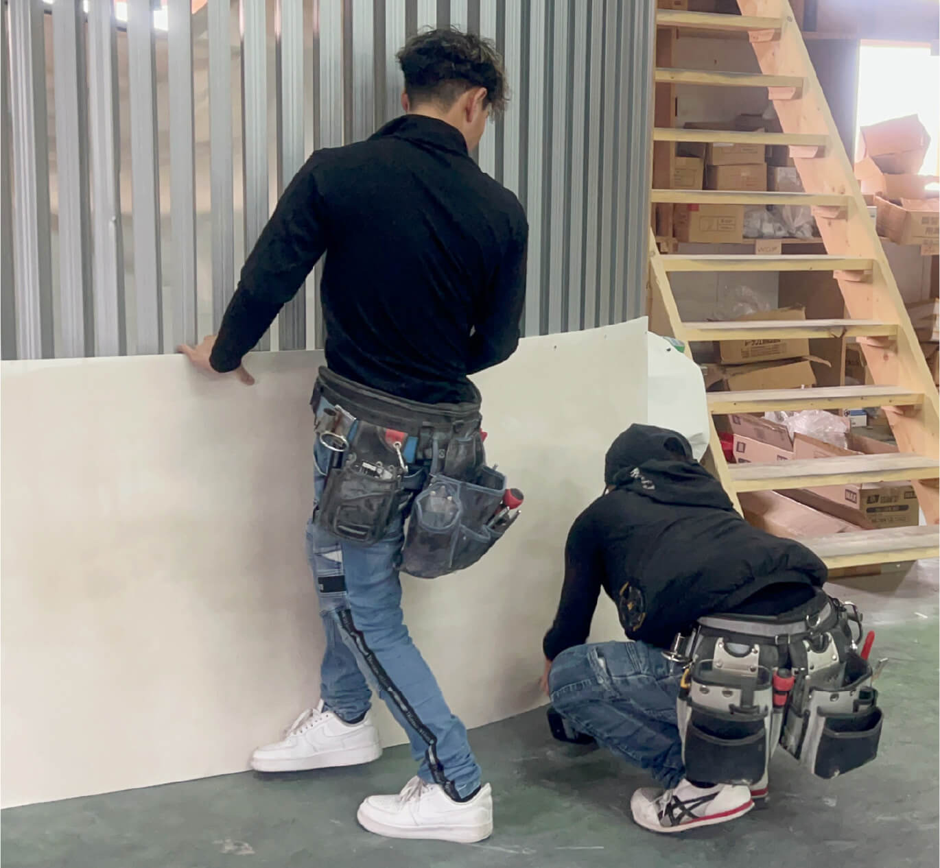 未経験者大歓迎!初めの一ヵ月は、社内の倉庫を使ってボードを貼る練習から始めていただきます。工具の扱い方をマスターし、ある程度自分で作業ができるようになったら、現場に出て少しずつ手伝いをしていきましょう!